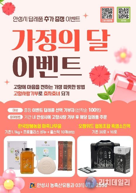 리치데일리 김상현 기자 | 안성시는 오이데이와 5월 가정의 달을 맞아 고향사랑기부제 참여 확대와 지역 농산물 소비 촉진을 위해 ‘오이데이 이벤트’와 ‘가정의 달 이벤트’를 추진한다고 밝혔다.
