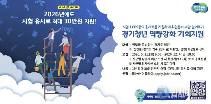 이 사업은 2025년 12월 1일~2026년 11월 30일 응시한 시험에 대해 1인당 최대 30만 원까지 응시료를 지원하며, 동일 시험의 경우 최대 3회까지 지원한다.