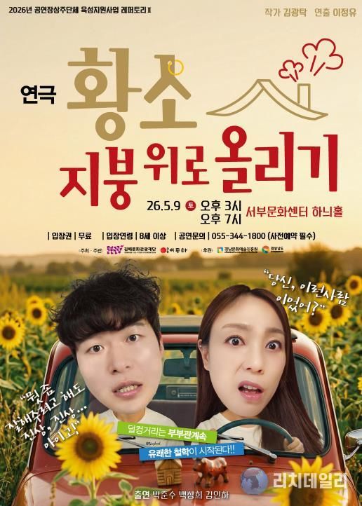 리치데일리 김상현 기자 | (재)김해문화관광재단 김해서부문화센터는 경남문화예술진흥원이 주관하는 ‘2026 공연장상주단체 육성지원사업’에 선정되어, 오는 5월 9일 두 번째 레퍼토리 공연 연극 '황소, 지붕위로 올리기'를 선보인다.