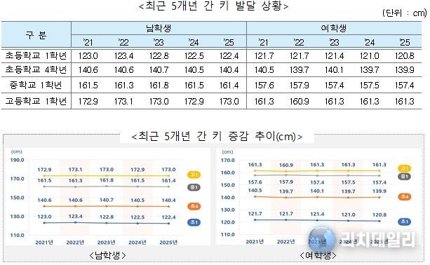 키 발달 상황을 보면, 남학생의 경우 초등학교 1학년은 122.4cm, 4학년은 140.4cm, 중학교 1학년은 161.4cm, 고등학교 1학년은 173.0cm이다. 여학생의 경우 초등학교 1학년은 120.8cm, 4학년은 139.9cm, 중학교 1학년은 157.4cm, 고등학교 1학년은 161.3cm로 남·여 학생 모두 이전 연도와 유사했다.