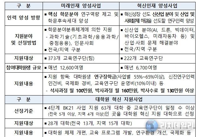 두뇌한국(BK)21 사업은 석·박사급 인재 양성 및 세계 수준의 연구중심대학 육성을 목표로 1999년부터 추진되어 온 대표적인 대학원 지원 사업이다. 현재 4단계 사업(7년, ’20.9.~’27.8.)이 운영 중이며, 매년 약 2만 명의 대학원생과 신진 연구자를 지원하고 있다.