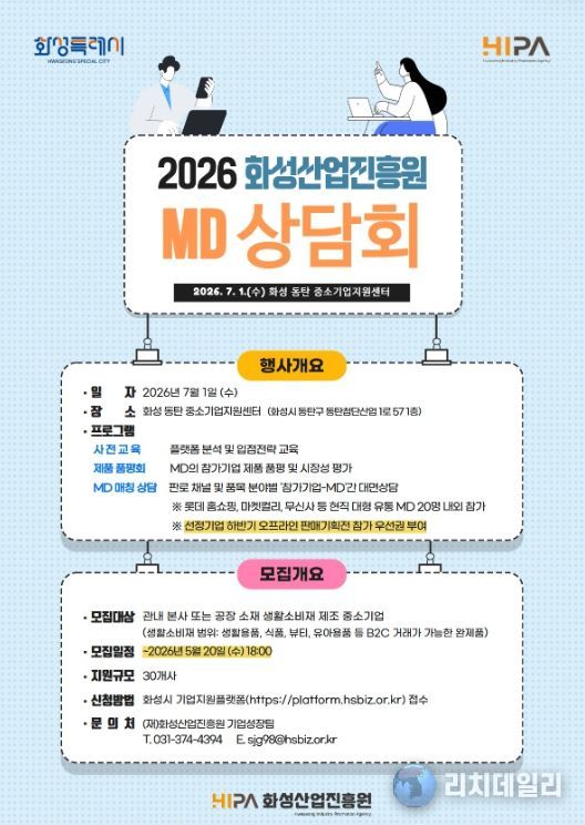 리치데일리 김상현 기자 | 화성산업진흥원(원장 전병선)은 화성시 생활소비재 기업의 대형 유통망 진입과 신규 판매채널 확보를 지원하기 위해 ‘2026년 화성산업진흥원 MD 상담회’를 개최하고, 오는 5월 20일까지 참여기업을 모집한다.