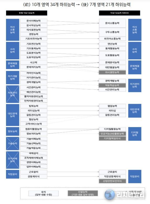 또한 기존의 10개 영역, 34개 하위능력에서 7개 영역, 21개 하위능력으로 재구조화한다. 노동시장 변화에 따라 활용도가 낮아진 항목은 과감히 폐지하고, 인공지능(AI) 활용능력, 디지털책임의식, 산업안전보건의식 등 미래 핵심 영역을 신설하여 제도의 현장성을 대폭 강화했다.