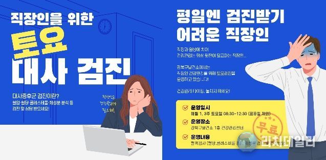 리치데일리 김상현 기자 | 서울 강북구 보건소 건강관리센터가 평일에 시간을 내기 어려운 직장인들의 건강 회복을 위해 ‘직장인 맞춤형 토요 대사증후군 검진 서비스’를 운영하며 구민 건강권 확보에 나섰다.