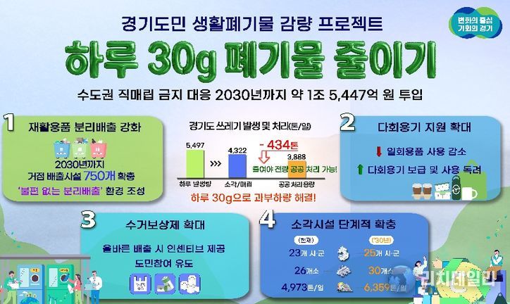 리치데일리 김상현 기자 | 수도권 직매립 금지에 따른 생활쓰레기 감량을 위해 경기도가 2030년까지 5년간 약 1조 5,447억 원을 투입하는 ‘하루 30g, 도민실천형 생활폐기물 감량 프로젝트’를 추진한다.