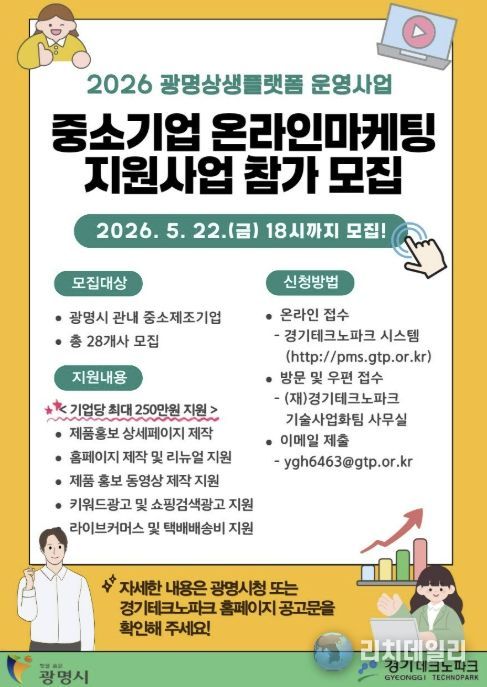 시는 관내 중소기업의 온라인 시장 진출과 판로 확대를 지원하는 ‘2026년 광명시 중소기업 맞춤형 온라인 마케팅 지원사업’ 참여기업을 오는 5월 22일까지 모집한다.
