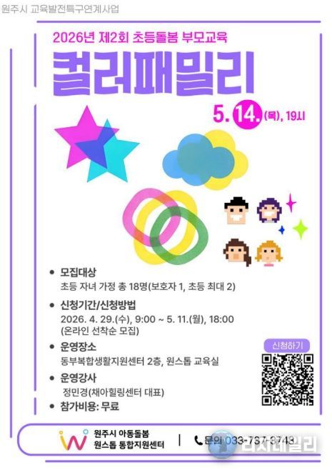 리치데일리 김상현 기자 | 원주시 아동돌봄 원스톱통합지원센터는 다음 달 14일 오후 7시, 관내 초등학생 자녀와 보호자를 대상으로 가족 간의 이해와 소통을 돕는 부모교육 프로그램 ‘컬러패밀리’를 운영한다.