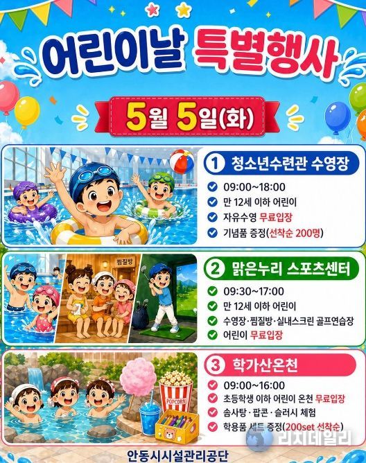 리치데일리 김상현 기자 | 안동시시설관리공단은 제104회 어린이날을 맞아, 오는 5월 5일 공단이 운영하는 주요 공공시설 3곳을 어린이와 가족들을 위해 무료로 개방하고 다채로운 체험행사를 운영한다고 밝혔다.