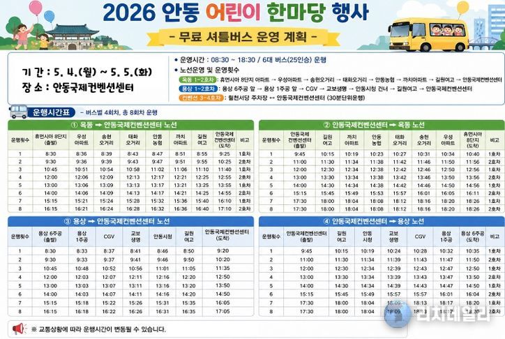 리치데일리 김상현 기자 | 안동시와 안동청년회의소는 제104회 어린이날을 맞아 오는 5월 4일부터 5일까지 안동국제컨벤션센터(ADIC)에서 펼쳐지는 ‘2026 안동 어린이 한마당’ 행사에서, 방문객 편의를 위한 무료 셔틀버스를 운영한다고 밝혔다.