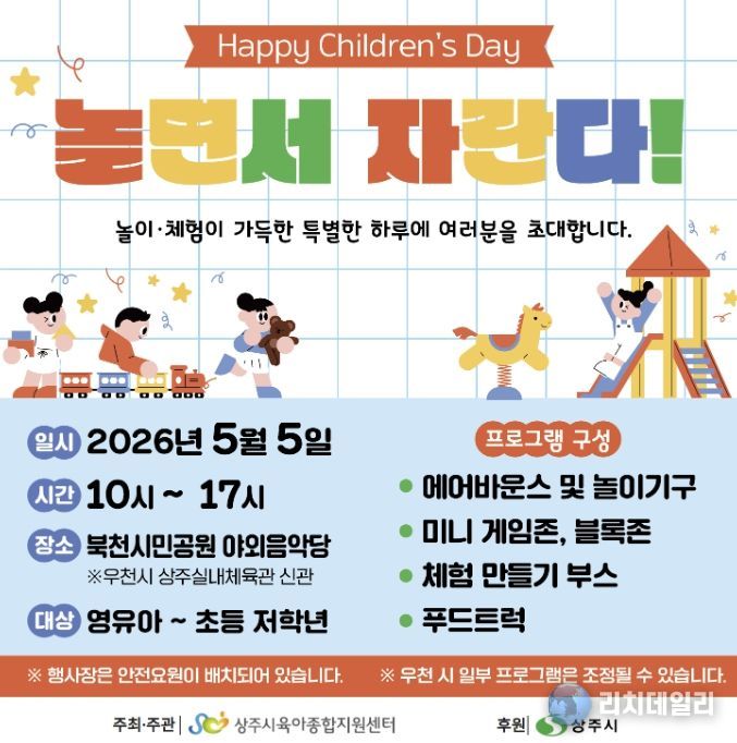 리치데일리 김상현 기자 | 상주시는 제104회 어린이날을 맞아 오는 5월 5일 북천시민공원 야외음악당에서 ‘Happy Children`s Day – 놀면서 자란다!’를 주제로 어린이날 기념행사를 개최한다.