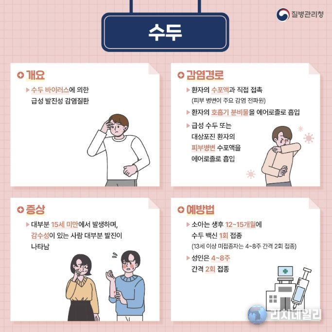 수두는 수두대상포진 바이러스에 의해 발생하는 급성 발진성 감염병으로, 발열과 함께 전신에 가려움을 동반한 물집성 발진이 나타나는 것이 특징이다. 기침이나 재채기를 통한 비말과 수포액 접촉 등을 통해 쉽게 전파되며, 전염력이 강해 어린이집, 유치원, 학교 등 집단생활 시설을 중심으로 확산할 가능성이 높다.