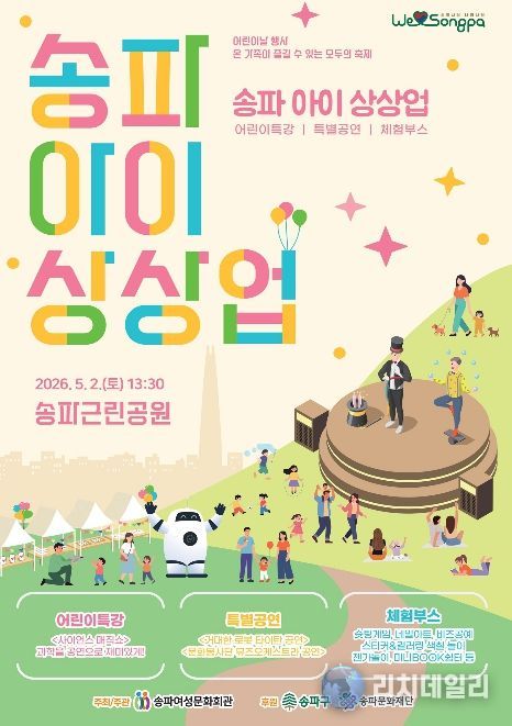 서울 송파구가 오는 5월 2일(토) 13시 30분부터 17시까지 송파근린공원(송파대로42길 29)에서 체험형 축제 ‘송파 아이 상상 업(UP)’을 개최한다고 밝혔다.