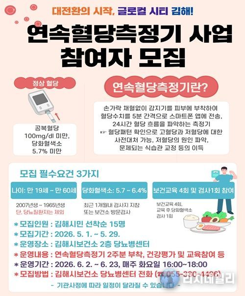 사업 참여자들에게는 2주분의 연속혈당측정기 부착, 총 5번에 걸친 관련 보건교육과 관련상담, 검진 등의 서비스가 제공된다. 문의는 김해시보건소 만성질환관리팀으로 하면 된다.