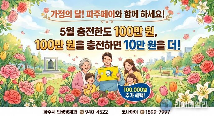 리치데일리 김상현 기자 | 파주시는 5월 가정의 달을 맞아 5월 1일부터 5월 31일까지 한 달간 지역화폐 파주페이의 월 충전한도를 기존 70만 원에서 100만 원으로 상향한다.
