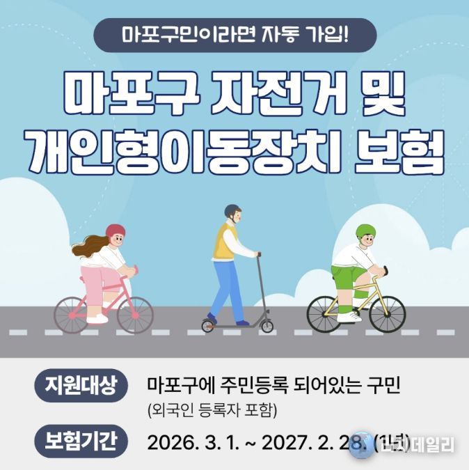 리치데일리 김상현 기자 | 마포구는 자전거와 개인형 이동장치(PM) 이용 중 발생할 수 있는 사고로부터 구민을 보호하기 위해 ‘2026년 마포구민 자전거 및 개인형 이동장치 단체보험’을 운영한다.