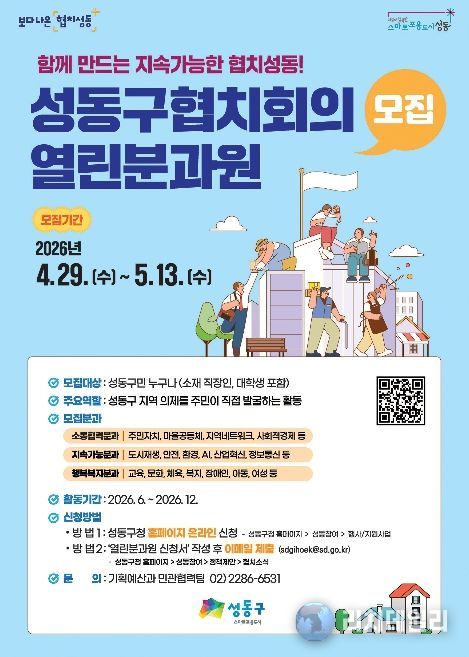 리치데일리 김상현 기자 | 서울 성동구는 지역사회 주요 현안 해결과 민관 협치 활성화를 위해 '2026년 성동구 협치회의 열린분과원'을 4월 29일부터 5월 13일까지 15일간 모집한다고 밝혔다.