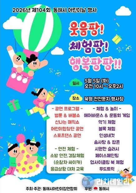 이번 행사는 동해시어린이집연합회(회장 배복자) 주관으로 추진되며, 다채로운 볼거리와 체험거리를 통해 어린이와 가족 모두가 함께 즐길 수 있는 어린이날 행사로 운영될 예정이다.