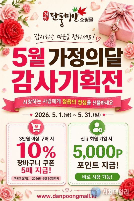 리치데일리 김상현 기자 | 정읍시가 다가오는 5월 가정의 달을 맞아 시민과 전국 소비자에게 감사의 마음을 전하고 지역 우수 농특산물 소비를 활성화하기 위해 ‘단풍미인쇼핑몰 5월 가정의 달 기획전’을 운영한다.