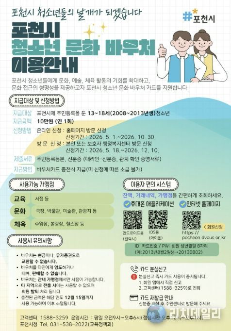 리치데일리 김상현 기자 | 포천시는 청소년의 문화 접근성을 높이고 다양한 체험 기회를 제공하기 위해 ‘포천시 청소년 문화 바우처 지원사업’을 본격 시행한다.
