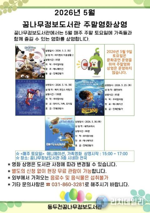 도서관 관계자는 "5월에 도서관에서 재미있는 영화를 보며 아이와 부모가 함께 유쾌하고 즐거운 시간을 보내길 바란다”라고 말했다.