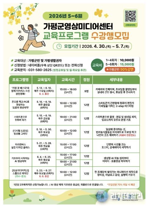 리치데일리 김상현 기자 | 가평군영상미디어센터가 군민들의 영상 미디어 콘텐츠 역량 강화를 위해 ‘5~6월 미디어 교육 프로그램’ 수강생을 4월 30일부터 선착순으로 모집한다.