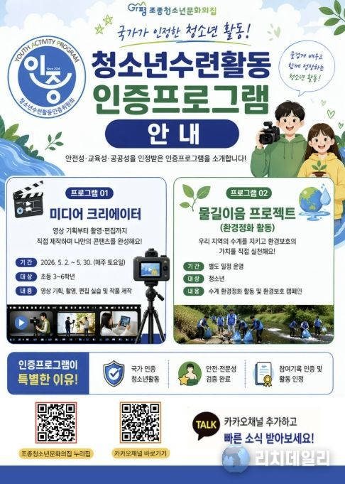 조종청소년문화의집 관계자는 “이번 인증은 프로그램의 질적 수준과 공신력을 확보한 중요한 계기”라며 “앞으로도 청소년이 주도적으로 성장할 수 있는 다양한 프로그램을 개발하겠다”고 밝혔다.