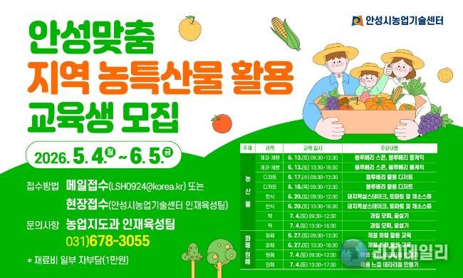 이번 교육은 6월부터 7월까지 안성에서 주로 재배되는 블루베리 등 과일류를 활용한 제과·떡·디저트 실습과, 지역 재배 화훼를 활용한 실습 등 총 2가지 주제로 진행된다. 총 12회에 걸쳐 196명의 교육생을 선발할 예정이다.