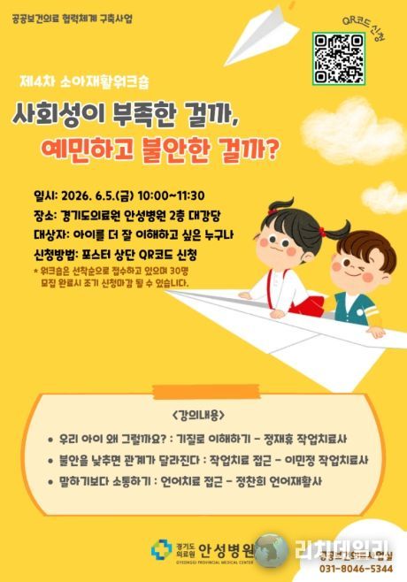 행사는 2026년 6월 5일 오전 10시부터 11시 30분까지 경기도의료원 안성병원 2층 대강당에서 진행되며, 주요 내용은 아동 기질 이해(작업치료 접근), 불안 감소를 통한 관계 개선, 언어 및 의사소통 중심 상호작용 방법 등으로 구성된다. 참가 대상은 “아이를 더 잘 이해하고 싶은 누구나”이며, 선착순 30명으로 모집한다. 신청은 포스터 내 QR코드 및 유선 접수를 통해 가능하며 조기 마감될 수 있다.