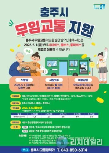 리치데일리 김상현 기자 | 충주시가 교통약자의 이동 편의를 높이고 사회활동 참여를 독려하기 위해 오는 5월 1일부터 ‘충주시 어르신 등 무임교통 지원 사업’을 전격 시행한다고 밝혔다.