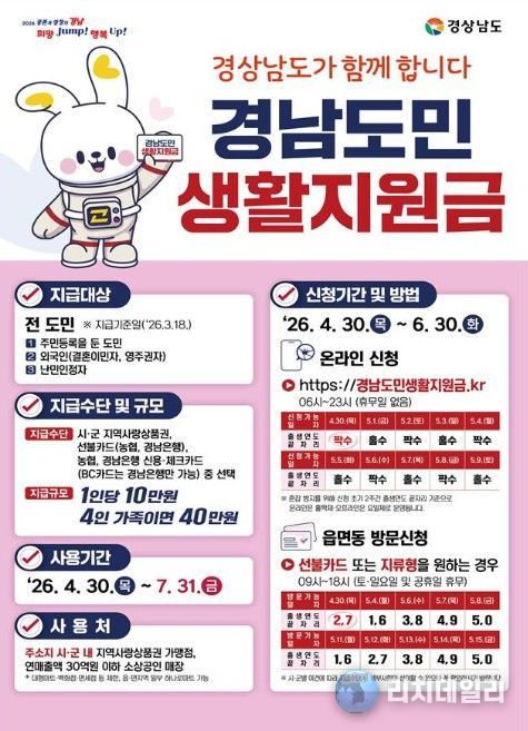 리치데일리 김상현 기자 | 경상남도는 4월 30일부터 전 도민을 대상으로 한 ‘경남도민 생활지원금’ 지급 신청을 본격적으로 시작한다고 밝혔다. 이번 지원금은 고물가 등 어려운 경제 여건 속에서 도민들의 생계 부담을 덜고, 지역 내 소비를 촉진해 민생 경제에 활력을 불어넣기 위해 마련됐다.