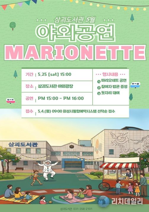 리치데일리 김상현 기자 | 화성시립 삼괴도서관은 5월 가정의 달을 맞아 오는 5월 23일, 도서관 야외광장에서 가족 단위 이용자를 위한 특별한 문화행사를 운영한다. 따뜻한 봄날의 야외 공간에서 누구나 편안하게 즐길 수 있도록 마련된 이번 행사는 도서관을 찾는 시민들에게 색다른 문화 경험과 여유로운 시간을 제공할 예정이다.
