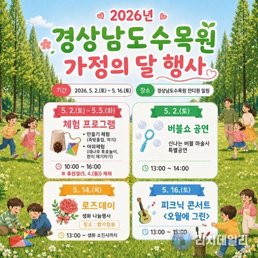 리치데일리 김상현 기자 | 경상남도산림환경연구원은 가정의 달 5월을 맞아 오는 5월 2일부터 16일까지 경상남도수목원 잔디원 일원에서 가족 단위 방문객을 위한 체험·공연·나눔 행사를 운영한다고 밝혔다.