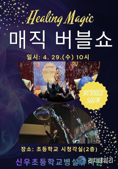 리치데일리 김상현 기자 | 신우초등학교병설유치원은 4월 29일 교내 시청각실에서 ‘힐링 매직버블쇼’ 공연을 개최했다고 밝혔다. 이번 공연은 유아들이 직접 참여하며 즐길 수 있는 체험형 프로그램으로 마련됐다.