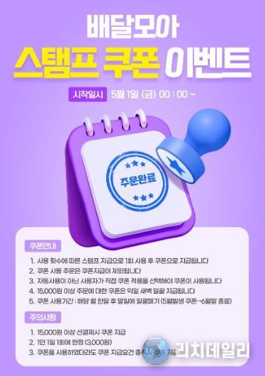 리치데일리 김상현 기자 | 제천시는 공공배달앱 ‘배달모아’ 이용 고객을 대상으로 5월 1일부터 ‘스탬프 쿠폰 이벤트’를 진행한다.
