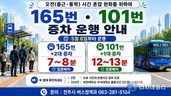 시는 101번 노선의 오전 7시 40분과 8시 5분 출발 차량 사이인 7시 52분 출발 차량을 투입해 기존 25분의 배차간격을 12~13분 수준으로 단축키로 했다. 이를 통해 학생들의 등교 편의를 높이고, 승객을 분산시켜 안전하고 쾌적한 시내버스 이용 환경을 조성한다는 구상이다.