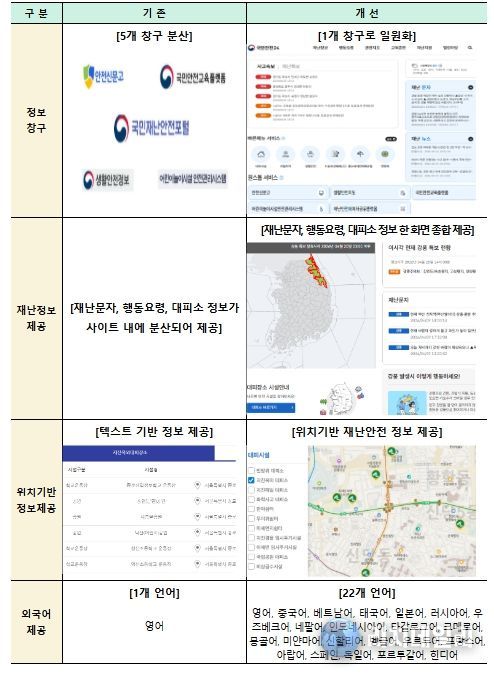기상특보나 사고정보 등 실시간 재난상황 정보를 제공하는 재난 유형은 기존 9종에서 26종으로 확대된다. 특히 재난별 상황정보, 재난문자, 대피소 위치, 국민행동요령을 통합 안내함으로써 위기 상황에서 국민이 신속하게 대처할 수 있도록 돕는다.