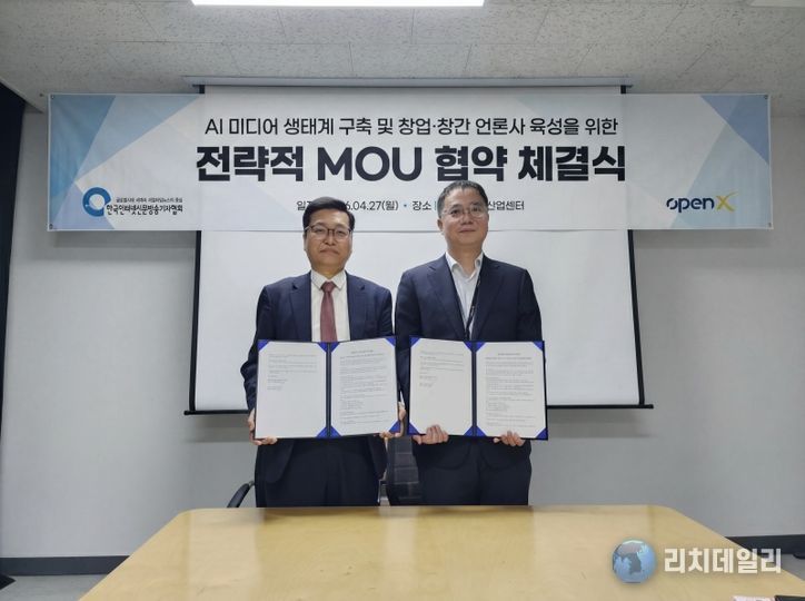 리치데일리 김상현 기자 | 한국인터넷신문방송기자협회(회장 전병길, 이하 협회)와 오픈엑스(대표 김미진)는 지난 2026년 4월 27일 서울 상암동 DMC첨단산업센터에서 업무협약(MOU)을 체결하고, 제휴 언론사 육성과 건강한 미디어 생태계 강화를 위해 적극 협력하기로 뜻을 모았다.