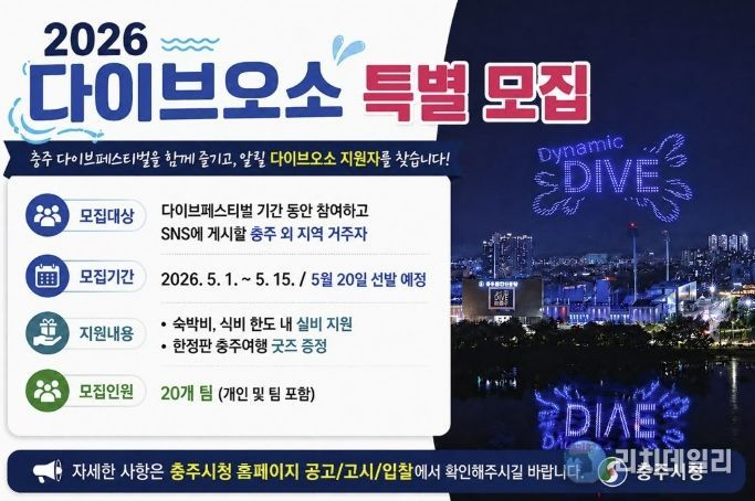리치데일리 김상현 기자 | 충주시가 ‘2026 충주 다이브 페스티벌 with MyK FESTA’을 맞아 지역 관광의 매력을 널리 알릴 특별 홍보단 ‘다이브 오소(O-SO) 충주’ 참여자를 모집한다고 밝혔다.