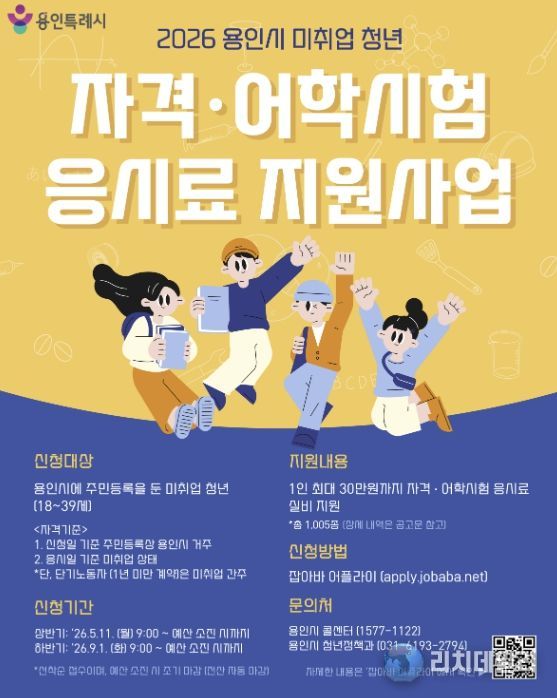 리치데일리 김상현 기자 | 용인특례시는 취업을 위해 어학과 자격증 시험 등을 준비 중인 청년을 위해 응시료 30만 원을 지원한다고 30일 밝혔다.
