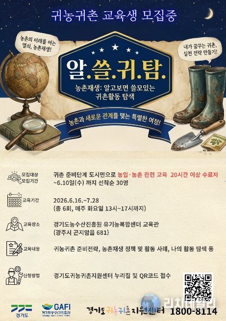 리치데일리 김상현 기자 | 경기도농수산진흥원은 6월 10일까지 ‘농촌재생: 알고보면 쓸모있는 귀촌활동 탐색(알쓸귀탐)’ 교육생을 모집한다.