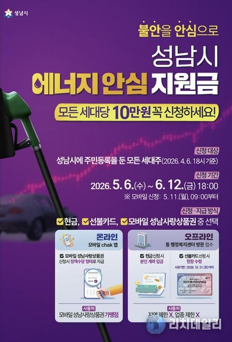 리치데일리 김상현 기자 | 성남시는 중동 사태에 따른 국가 자원안보 위기 경보 발령으로 경제적 부담이 커진 시민들을 지원하기 위해 전국 최초로 ‘성남시 에너지 안심지원금’을 오는 5월 6일부터 신청을 받는다고 밝혔다.