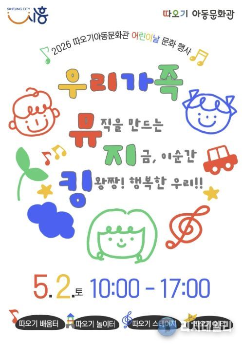 리치데일리 김상현 기자 | 시흥시 따오기아동문화관은 어린이날을 맞아 오는 5월 2일 오전 10시부터 오후 5시까지 따오기아동문화관 야외 일대에서 2026년 어린이날 문화행사 ‘우리가족 뮤지킹’을 개최한다.