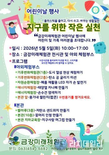 리치데일리 김상현 기자 | 군산시 금강미래체험관이 어린이날을 맞아 5월 5일 오전 10시부터 오후 5시까지 체험관 전시관과 야외 체험부스 일원에서 어린이 및 가족 단위 관람객을 대상으로 어린이날 기념 환경체험 프로그램 ‘지구를 위한 작은 실천’을 운영한다.