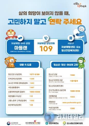 한편, 우울감 등 말하기 어려운 고민이 있을 경우 자살예방 상담전화 또는 군산시 정신건강복지센터를 통해 24시간 상담을 받을 수 있다.