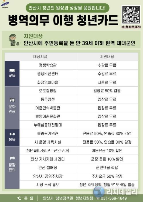 지원 대상은 안산시에 주민등록을 둔 39세 이하 제대군인이다. 신청은 안산시 통합예약시스템에서 할 수 있으며, 경기도 행정서비스 앱 ‘경기똑D’를 통해 모바일 카드로도 발급받을 수 있다.
