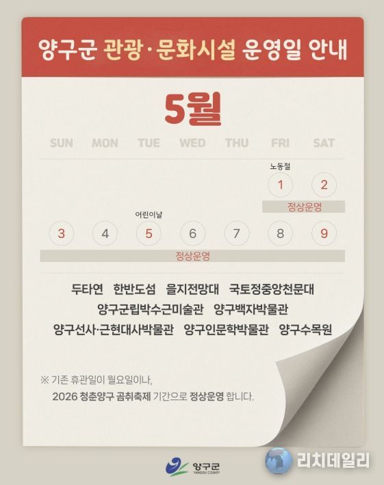 리치데일리 김상현 기자 | 양구군은 ‘2026 청춘양구 곰취축제’ 기간 동안 관광객 편의 증진과 지역 관광 활성화를 위해 관내 주요 관광·문화시설을 휴관일 없이 정상 운영한다.