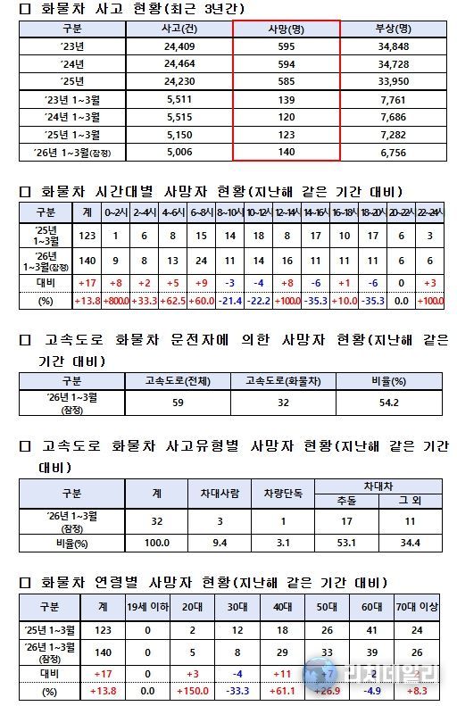 경찰청 교통사고 통계에 따르면 2026년 3월까지 발생한 화물차 사망사고(잠정)는 최근 3년 같은 기간 평균(1~3월) 발생한 사망자인 127.3명보다 9.9% 증가한 수준인 140명이 발생했다.