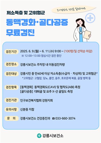 강릉시보건소는 오는 6월 9일(월)부터 11일(수)까지 인구보건복지협회 강원도지부와 연계해 동맥경화와 골다공증 무료검진을 실시한다.