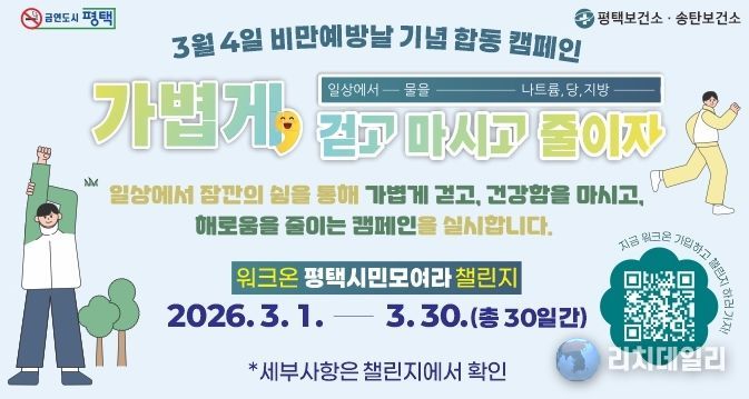 리치데일리 김상현 기자 | 평택시는 오는 3월 4일 ‘비만 예방의 날’을 맞아, 3월 한 달간 시민과 함께하는 ‘가볍게 걷고, 마시고 줄이자’ 합동 캠페인을 대대적으로 전개한다고 밝혔다.