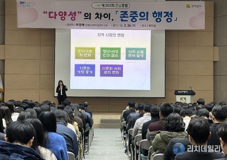 리치데일리 김상현 기자 | 전라남도는 24일 도청 왕인실에서 공직자 300여 명을 대상으로 이진아 브랜드유리더십센터 소장을 초청해 ‘다양성의 차이, 존중의 행정’을 주제로 제302회 전남포럼을 열었다.